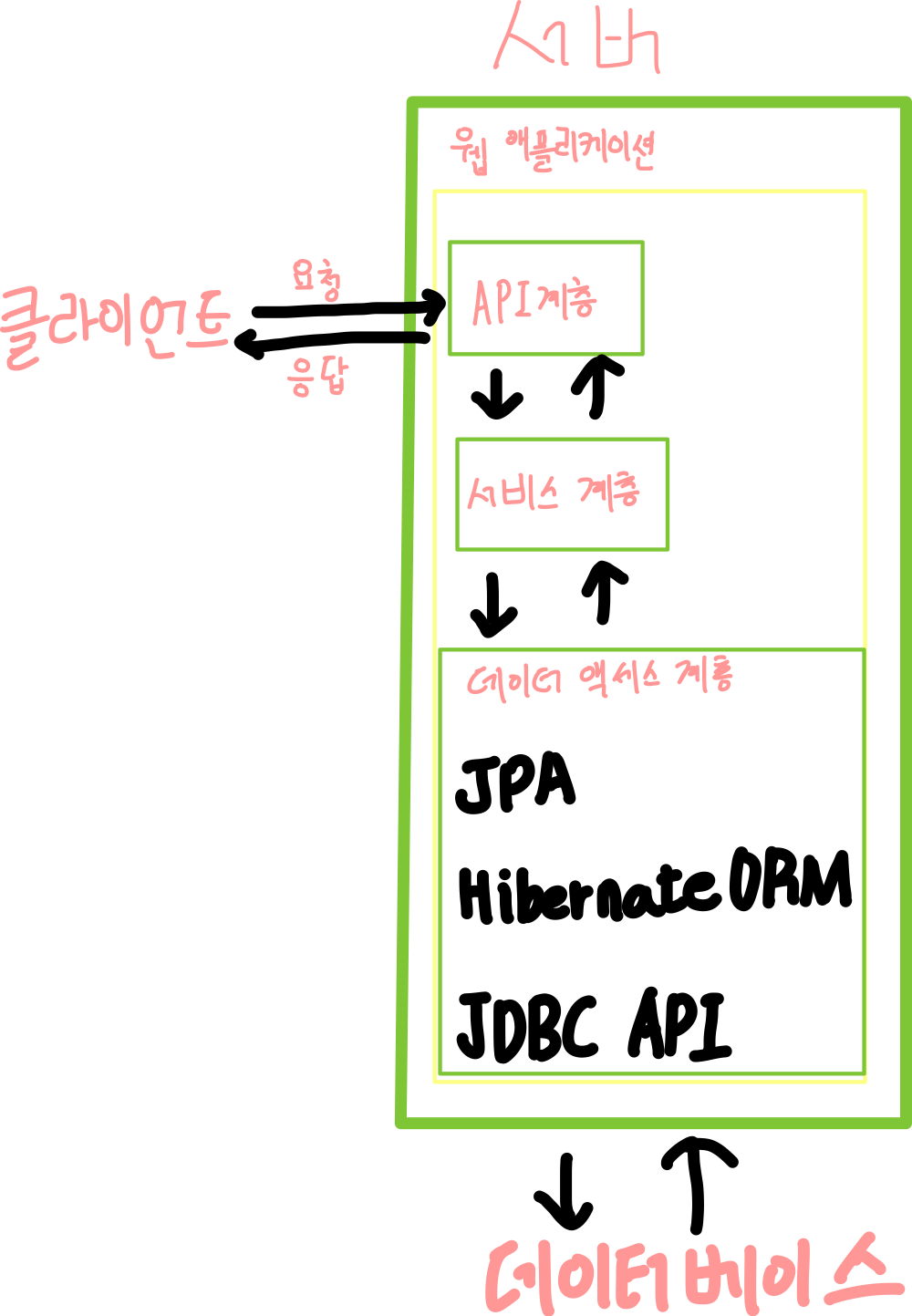 데이터 저장, 조회 등의 작업은 JPA를 거쳐 JPA의 구현체인 Hibernate ORM을 통해서 이루어지며 Hibernate ORM은 내부적으로 JDBC API를 이용해서 데이터베이스에 접근한다