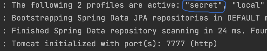 local 환경으로 실행했기 때문에 7777번으로 정상적으로 실행되고 profiles가 실행되는 것을 알려주고 있습니다.