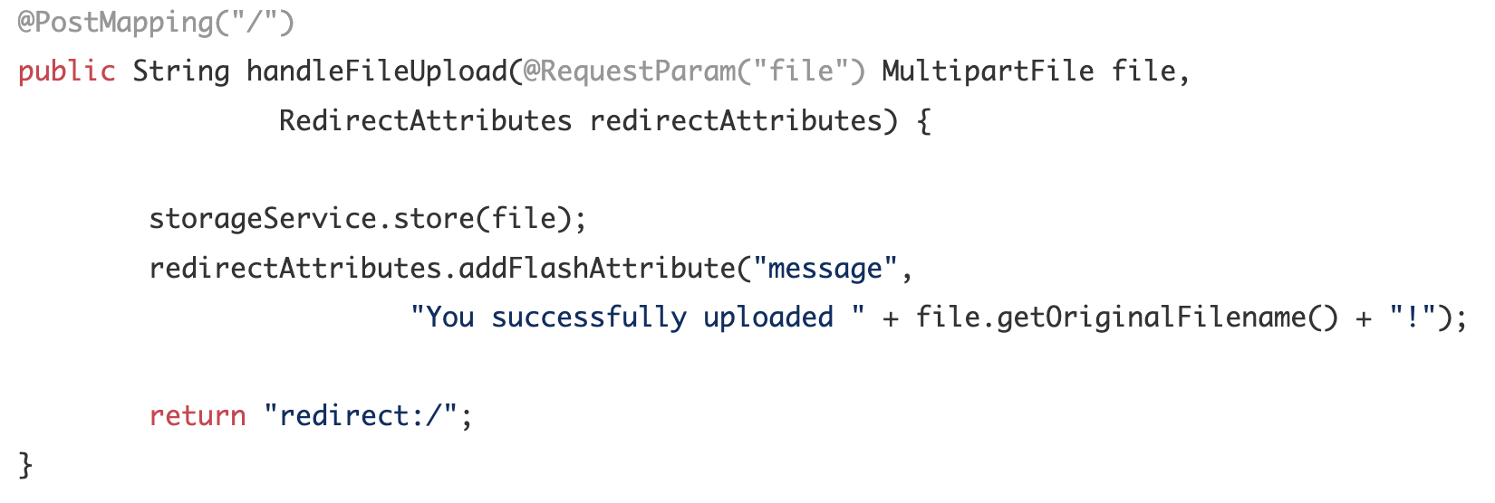 MultipartFile 의 형태로 받아서 storageService.store() 를 이용하여 파일을 저장한 뒤, 성공적으로 저장됐다는 메시지와 함께 리다이렉트 시키고 있다.