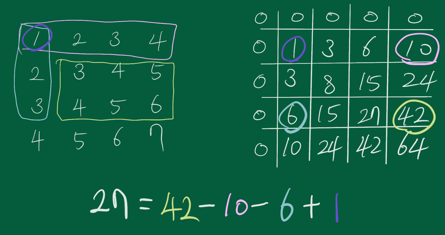 int answer = dp[x2][y2] - dp[x1 - 1][y2] - dp[x2][y1 - 1] + dp[x1 - 1][y1 - 1];
